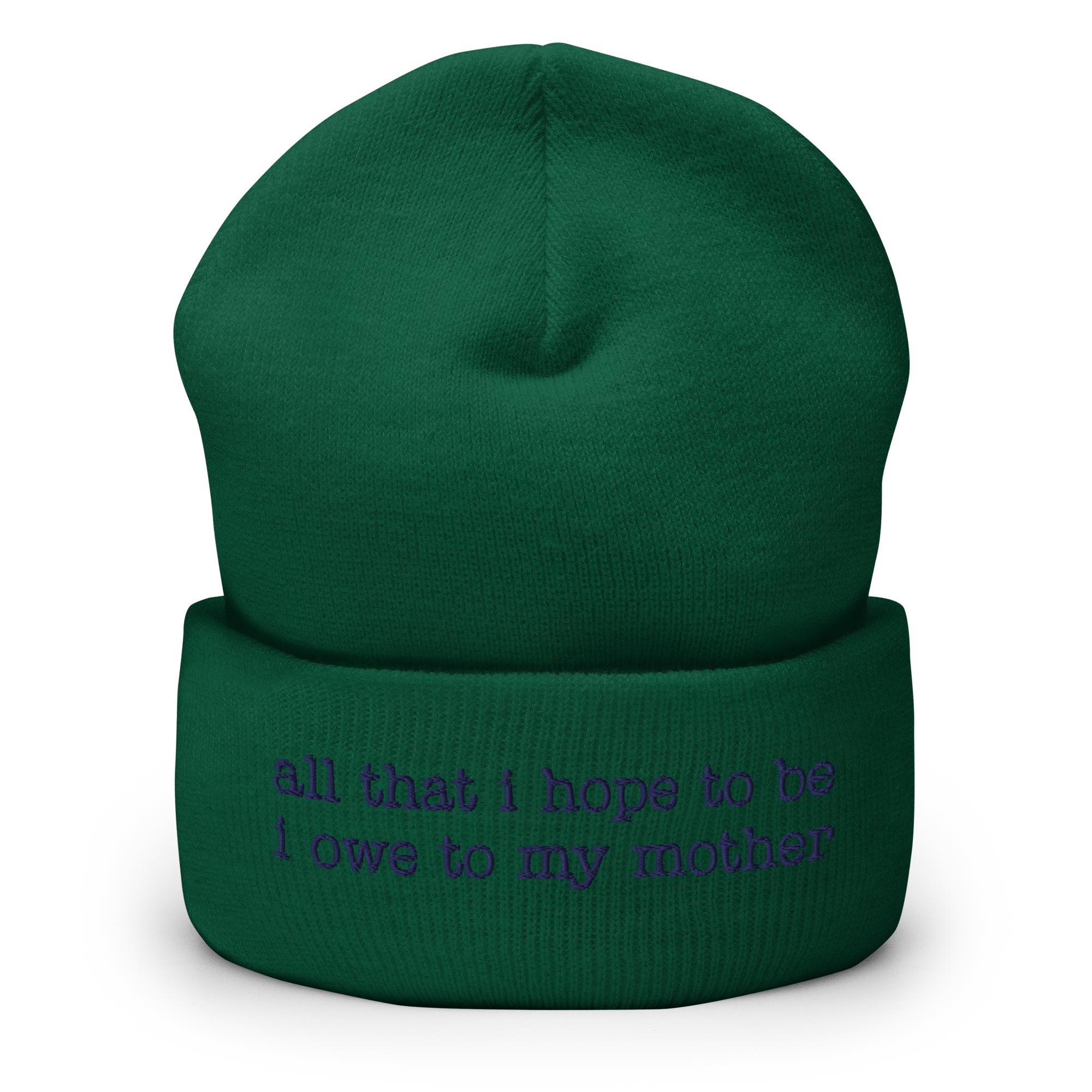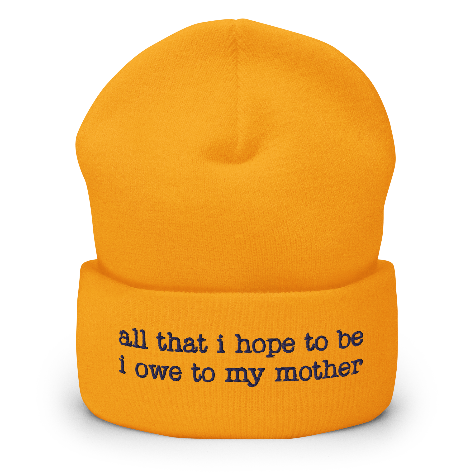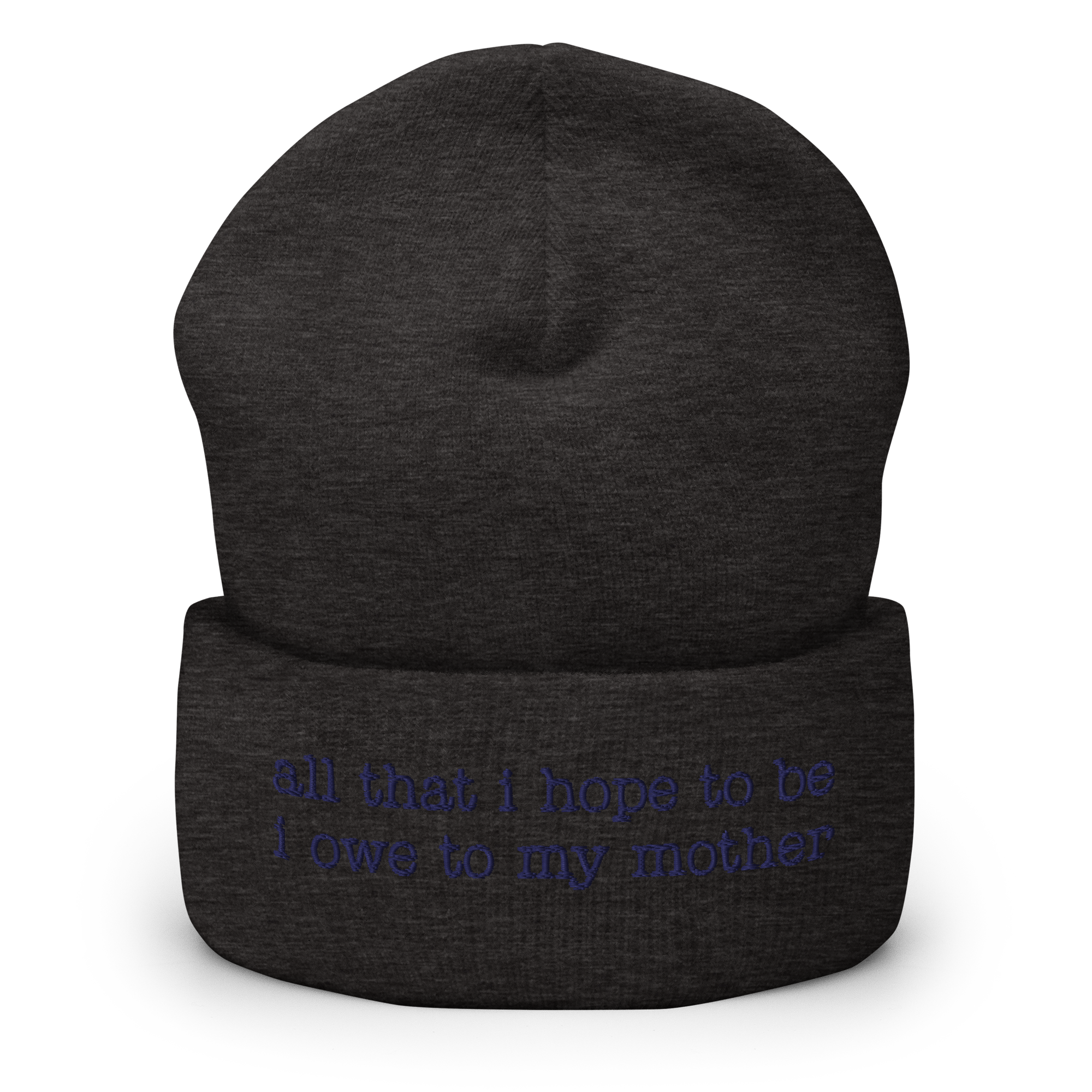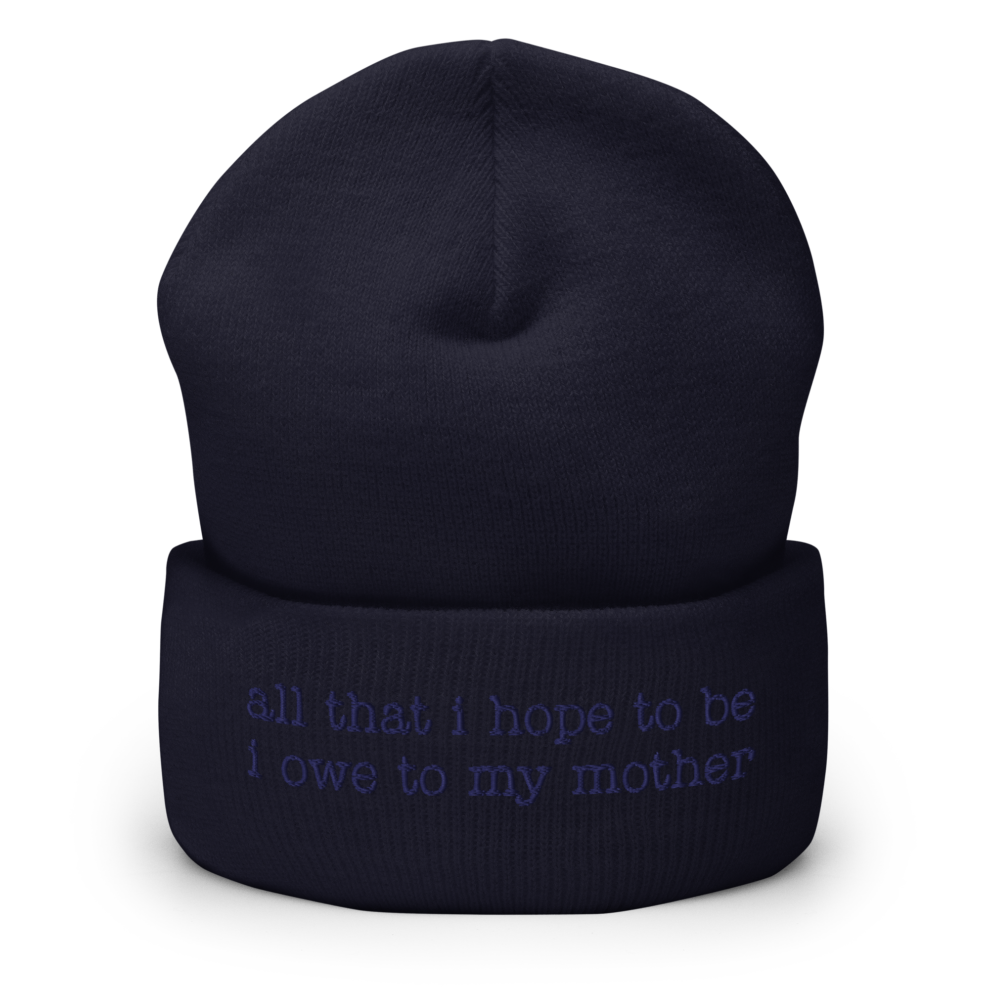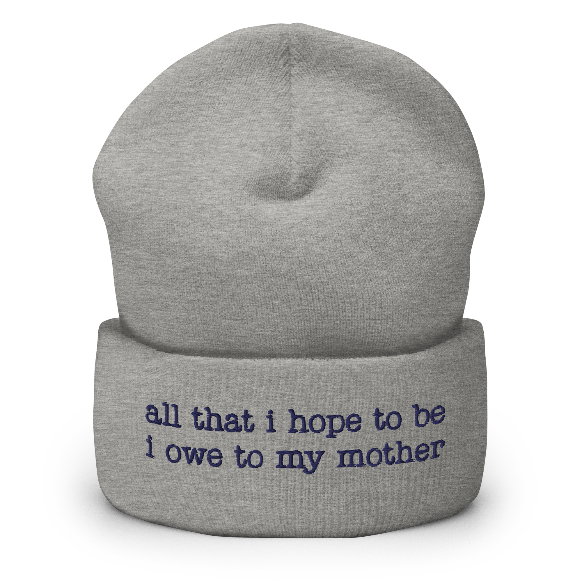 Celebrate your mother and the support of women worldwide with this “all that i hope to be i owe to my mother” IQ – inspired quote – beanie. It’s snug and form-fitting, so it will warm your head as well as your heart!